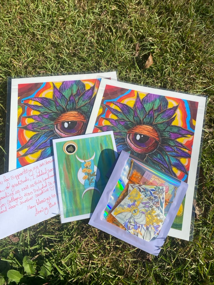 The small (4 x 5) mystery bundle comes with the 2.5” single sided while the large (8 x 10) comes with the 3” double sided acrylic keychain/accessory; can be used on keys, as a bag charm, on water bottles, or even style your clothing by attaching to your belt loop! “Single sided” indicates that the artwork is on one side while “double sided “ indicates that the artwork is on both sides! <3